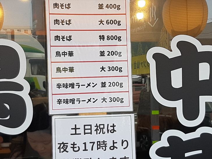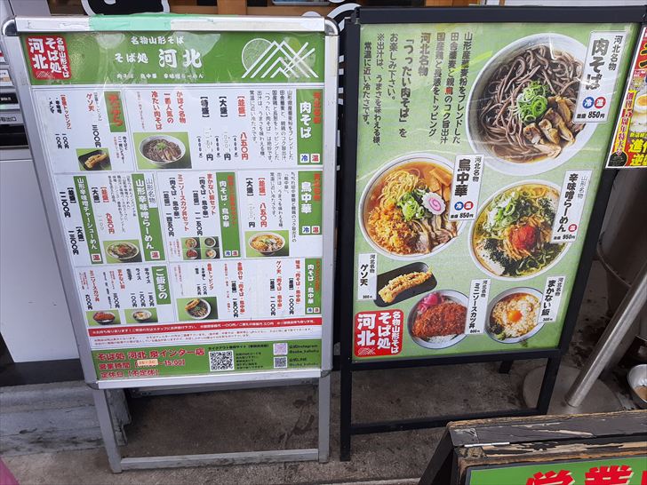 『そば処 河北 泉インター店』のメニューは、次の通りですね。肉そば、鳥中華の他に、つけ蕎麦、中華そば、油そば、山形辛味噌らーめんもありました。