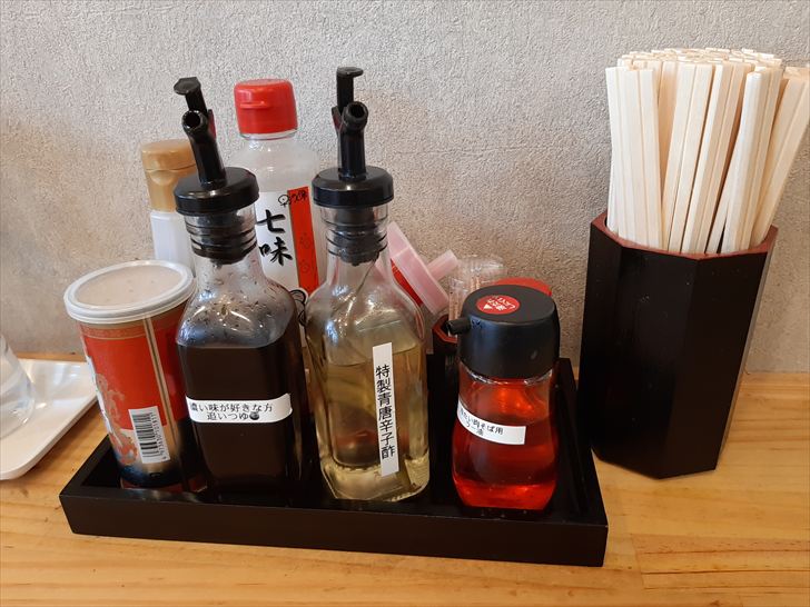 卓上調味料は、ラーメンコショウ、追いつゆ、青唐辛子酢、ラー油、醤油、七味にんにく、ゴマ、七味唐辛子がありました。