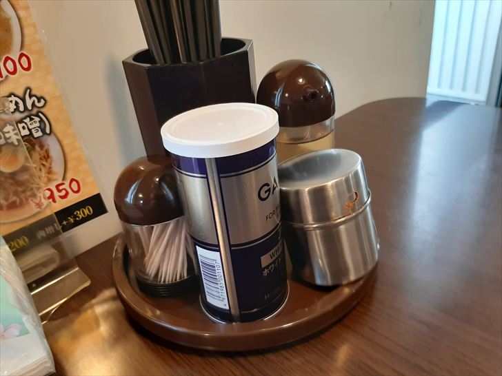 卓上調味料はホワイトペッパー、唐辛子、酢でした。