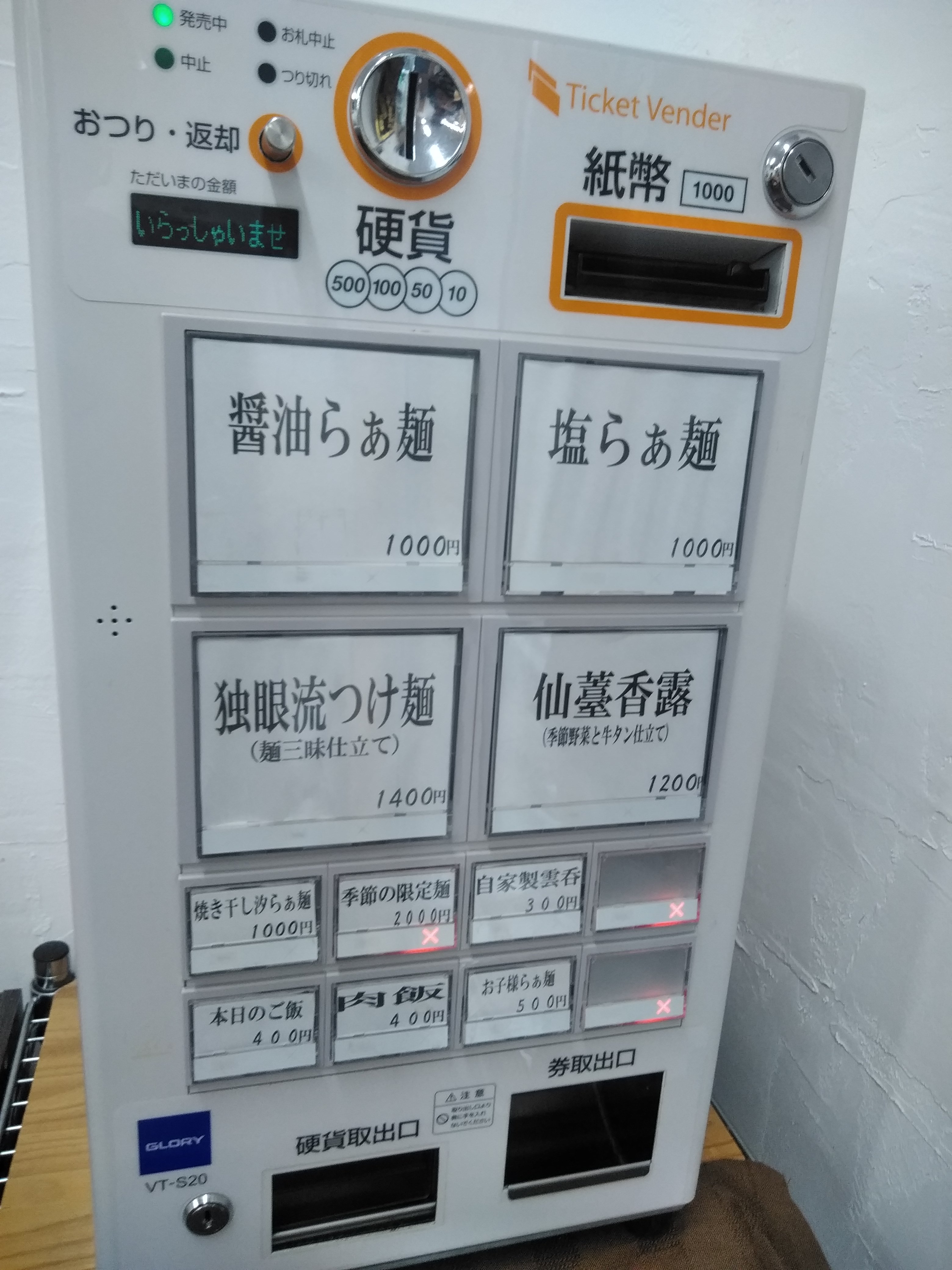 券売機で食券を購入します。季節の限定麺2000円はやってませんでした。2000円のラーメンとはどんなラーメンなんでしょうね?
