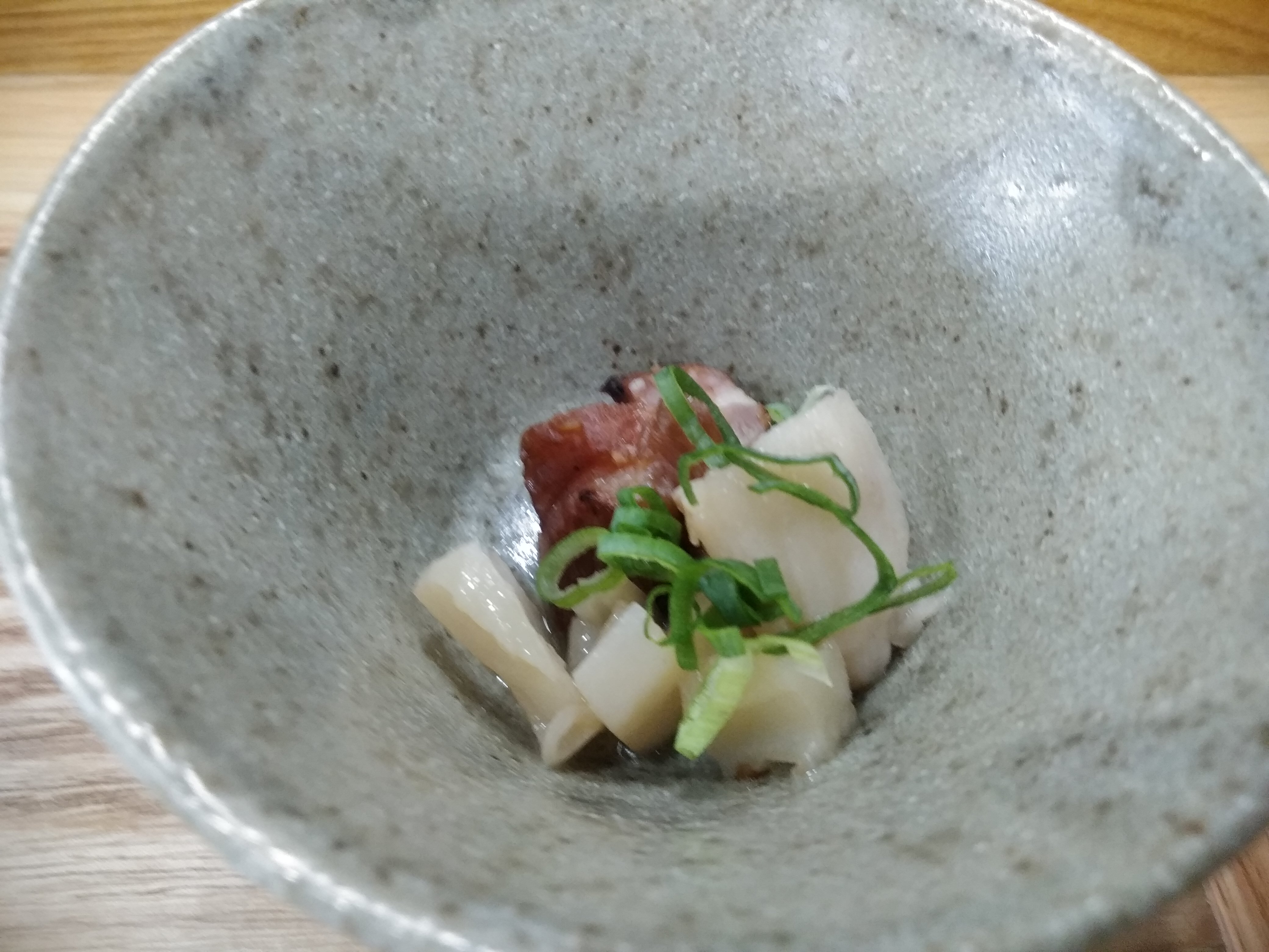 ラーメン店では珍しいと思いますが、先付けの小鉢が提供されました。レンコンとチャーシューにネギの和え物です。レンコンのコリコリ食感とチャーシューが合いますね。