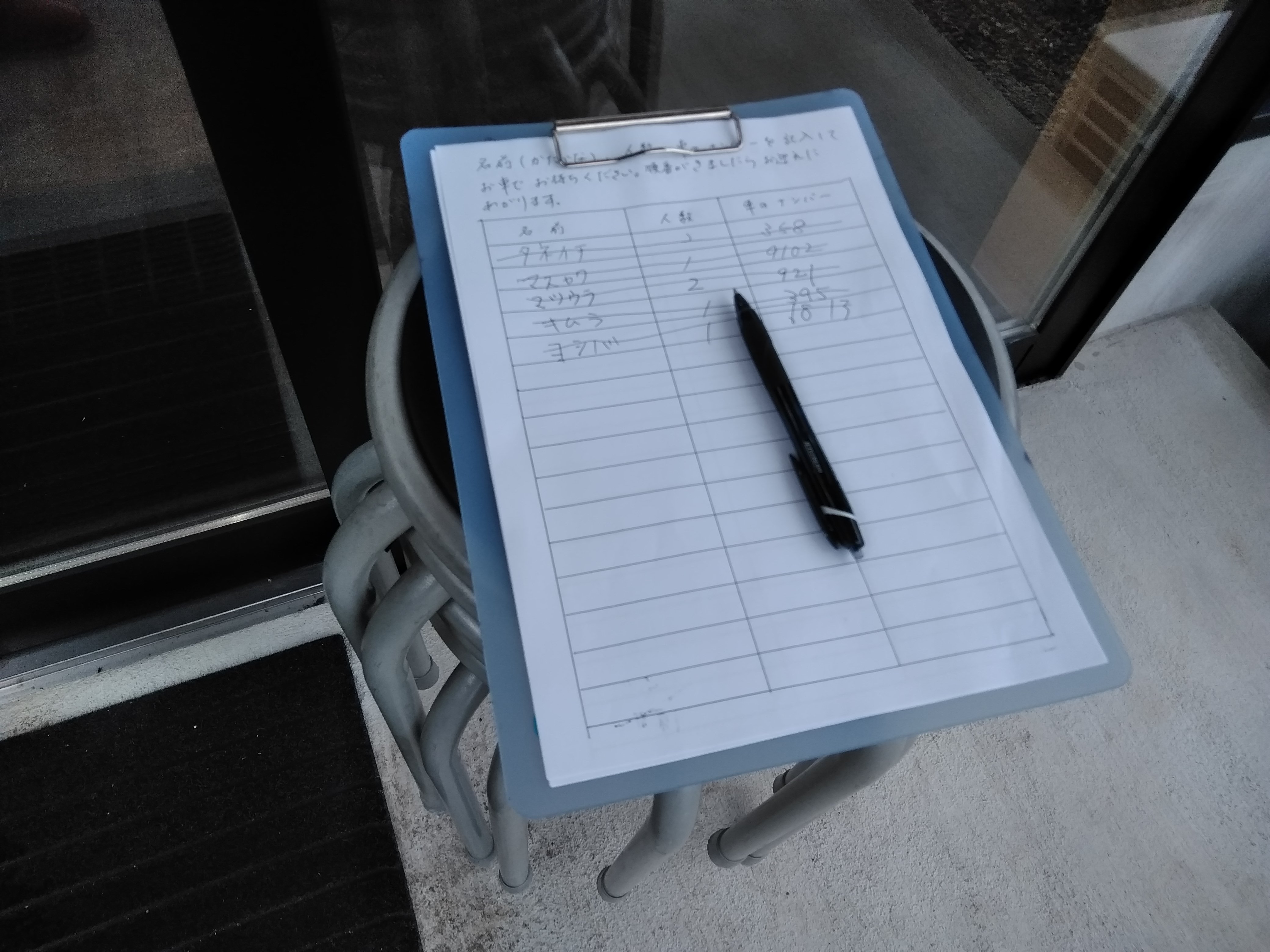 名前と人数と車のナンバーを記載します。それで、車の中で待機します。順番が来たら、お店の方が車まで知らせに来てくれます。お店の前で並ぶより嬉しいサービスですよね。