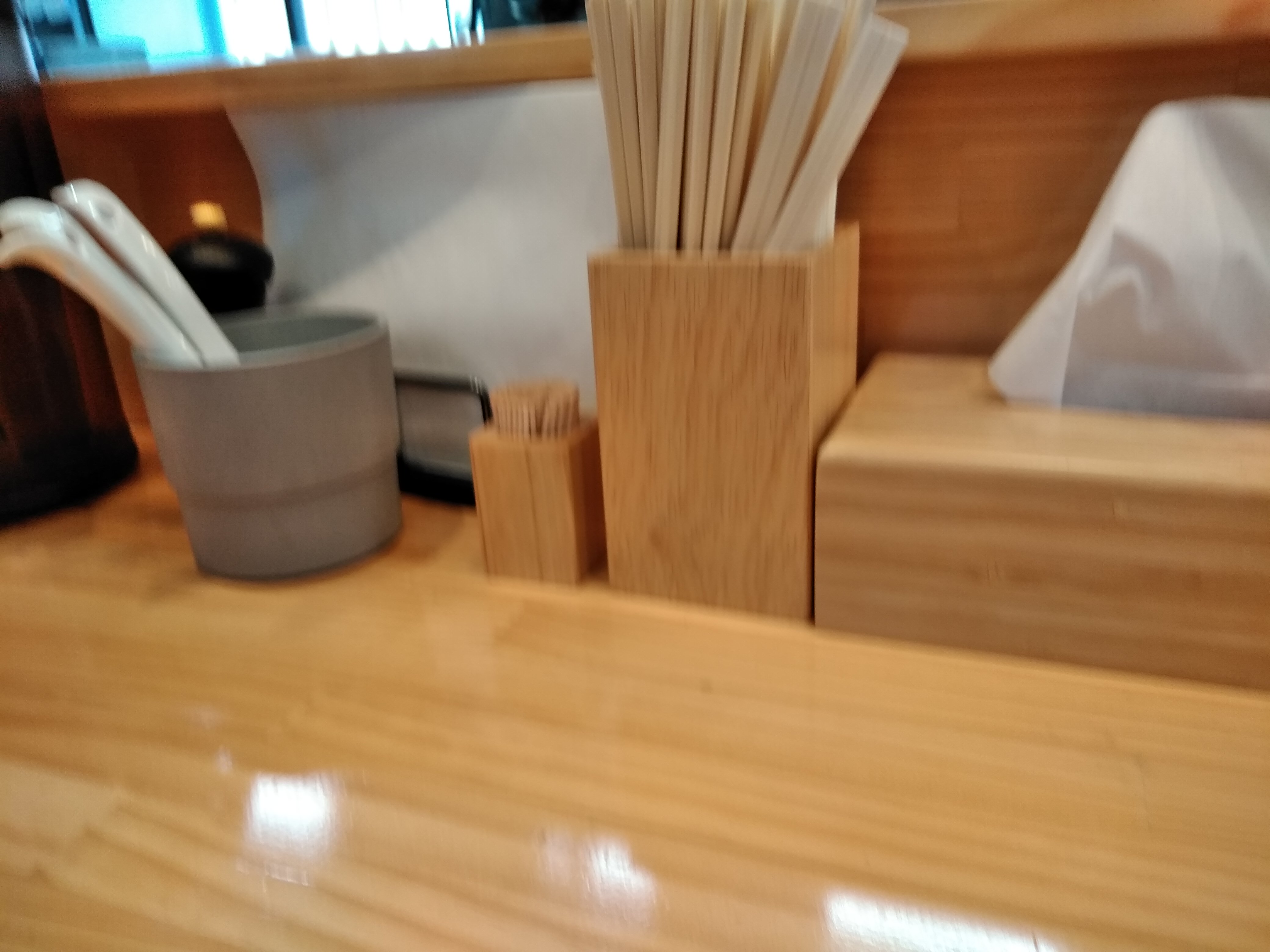 カウンター席のテーブルの上には、コショウ、レンゲ、割り箸、爪楊枝、ティッシュペーパー、水、紙エプロンがありました。