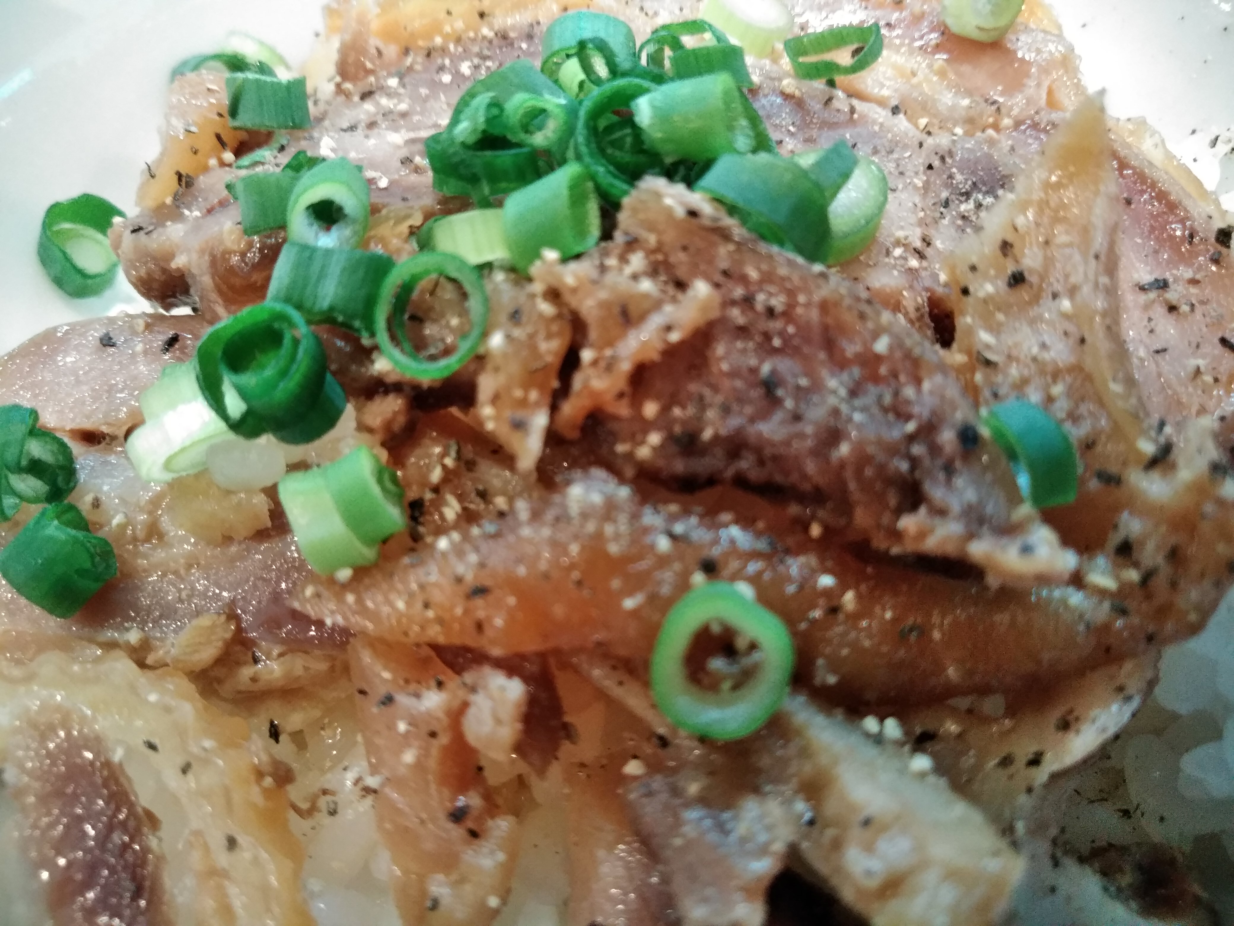 ご飯に親鶏肉と小口ネギとコショウと甘めのタレが掛かっています。親鶏肉がこりこりしていて美味しいですね。