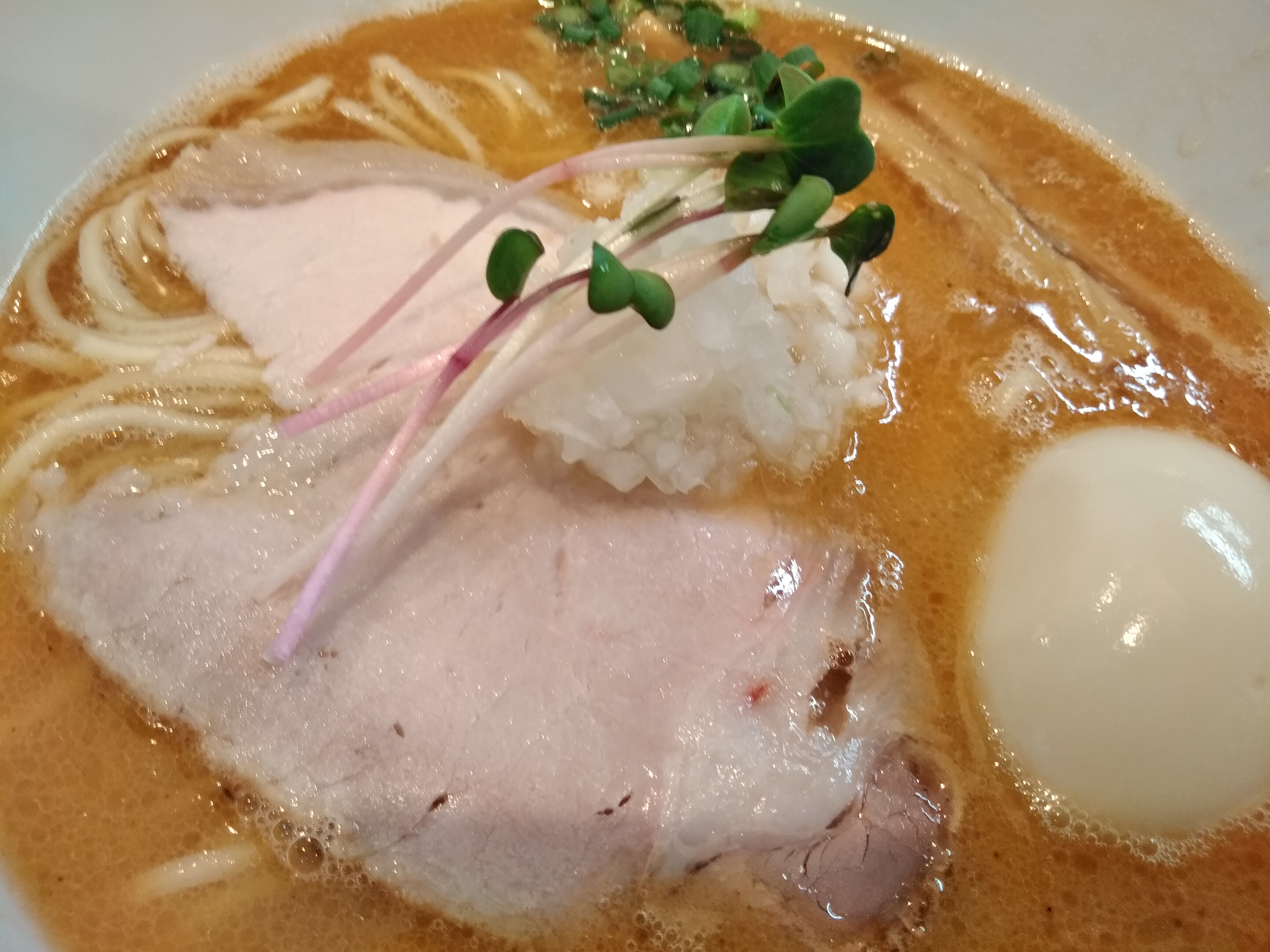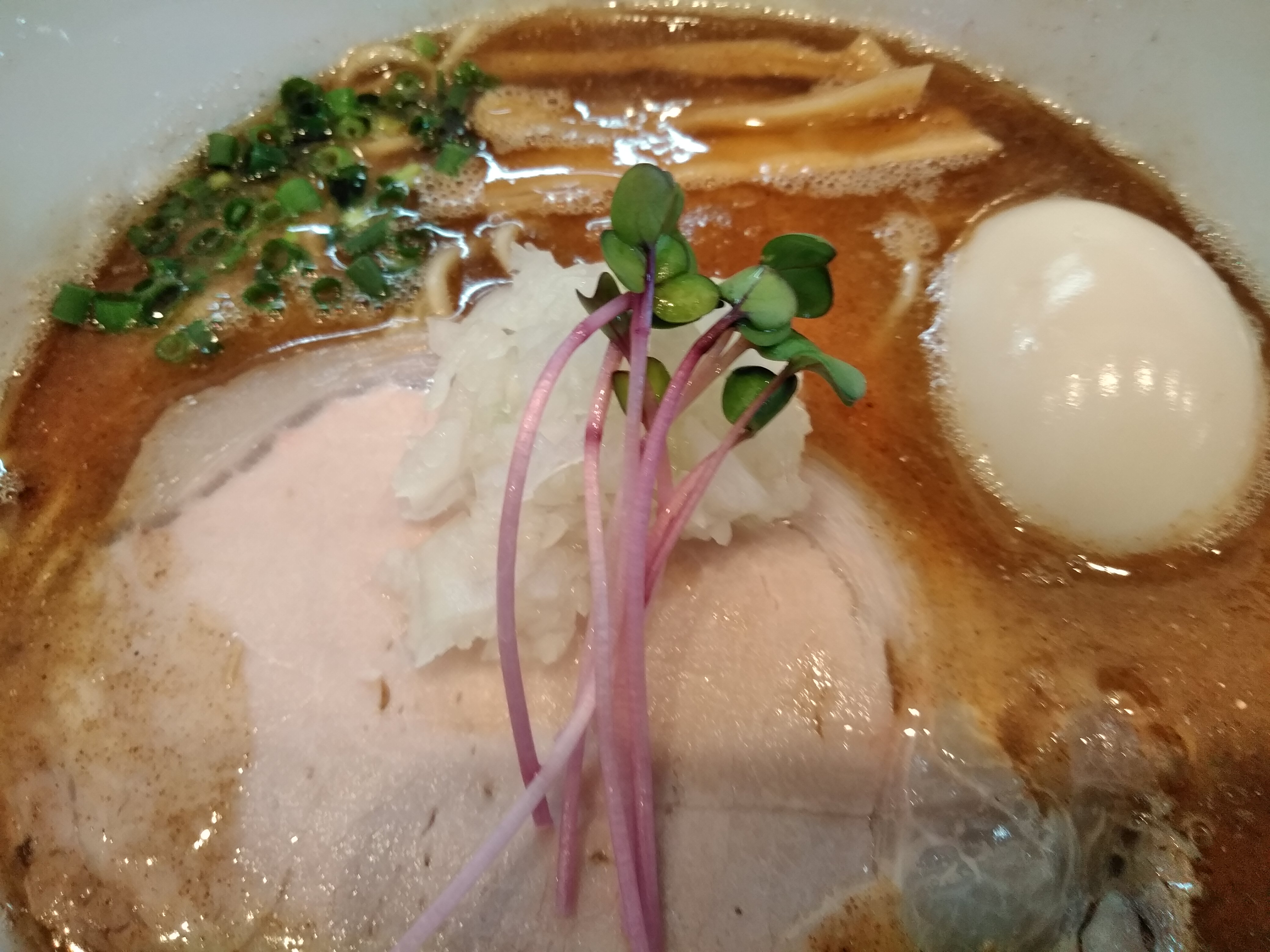 具材は、チャーシュー1枚、味玉、たまねぎ、小口ねぎ、メンマ、紅かいわれ大根が載っています。スープは濃厚で魚介の風味が良く好きな味でした。