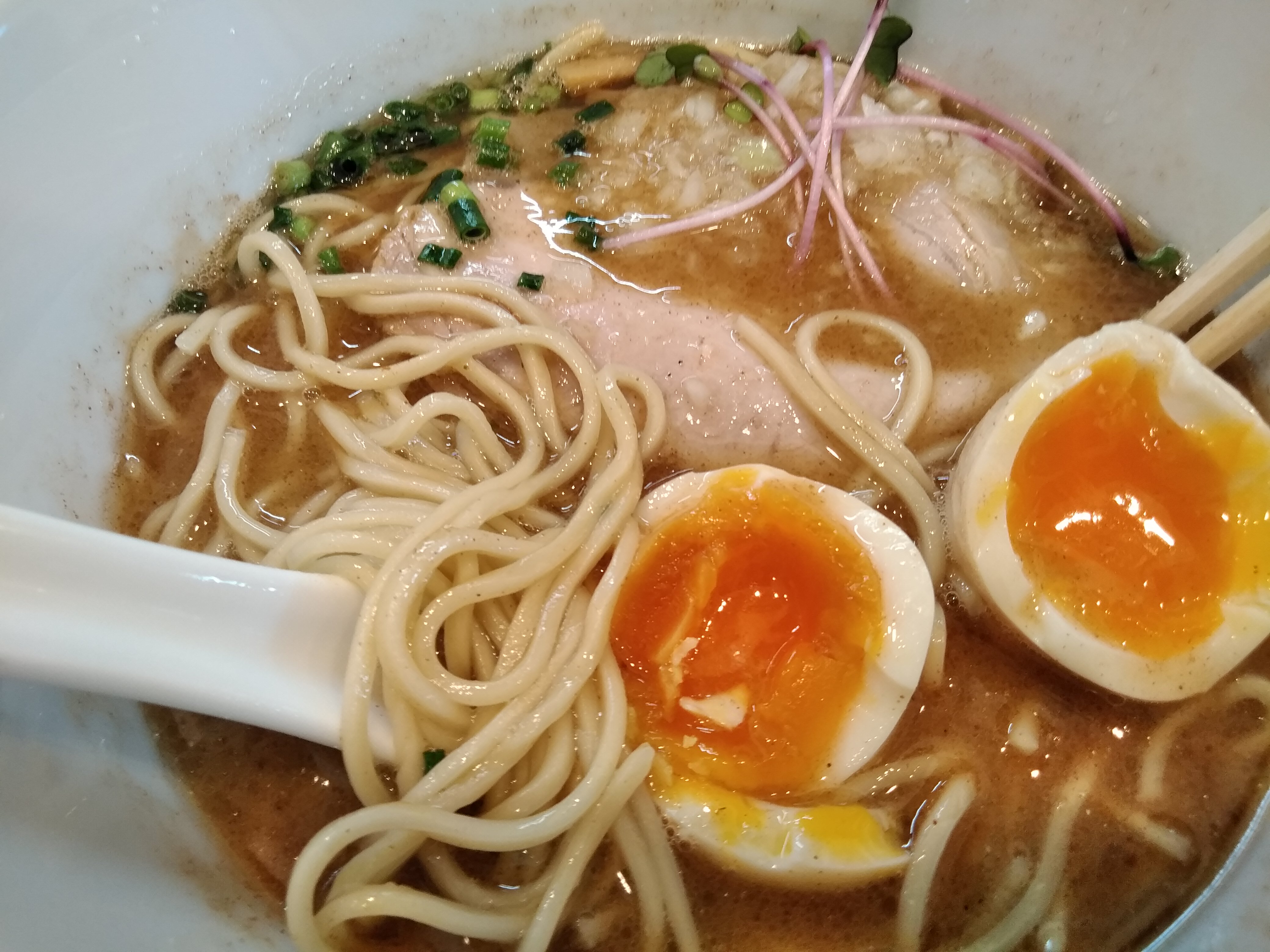 麺はパツパツ系でコシもあり美味しかったです。味玉は半熟具合も良く、甘めの味付けが好みでした。大きめのチャーシューは柔らかくてうまうま、このラーメンに合っていると思いました。